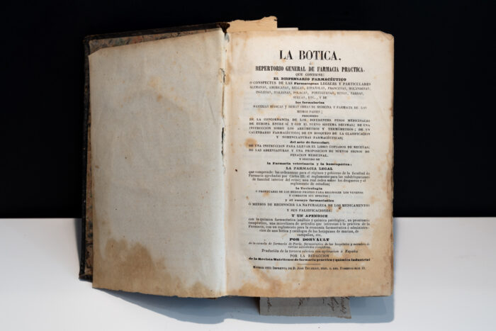 Col·leccions: Activitats comercials, Botica, Oficis i activitatsAquest volum d’origen francés i traduït a molts idiomes conté una gran quantitat de temàtiques relacionades amb la medicina i la farmàcia. Des de toxicologia i antídots, legislació a farmàcia homeopàtica o veterinària. Però el punt fort és la formulació d’infinitat de compostos per a tractar una gran quantitat d’afeccions.