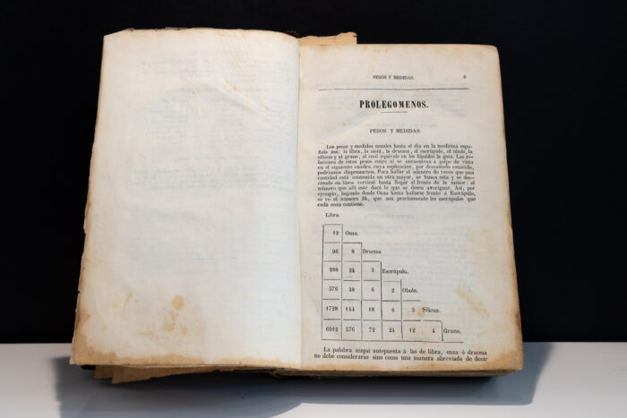 Es pot comprovar l’ús d’antigues unitats de mesura, hui totalment en desús, com ara l’escrúpol, òbol, síliqua, a més d’altres pròpies de l’antic sistema francés de mesura, que són traduïdes a les antigues mesures nacionals, totes desconegudes hui en dia (exemple: un muid francés equival a 16,9933 de cántara).